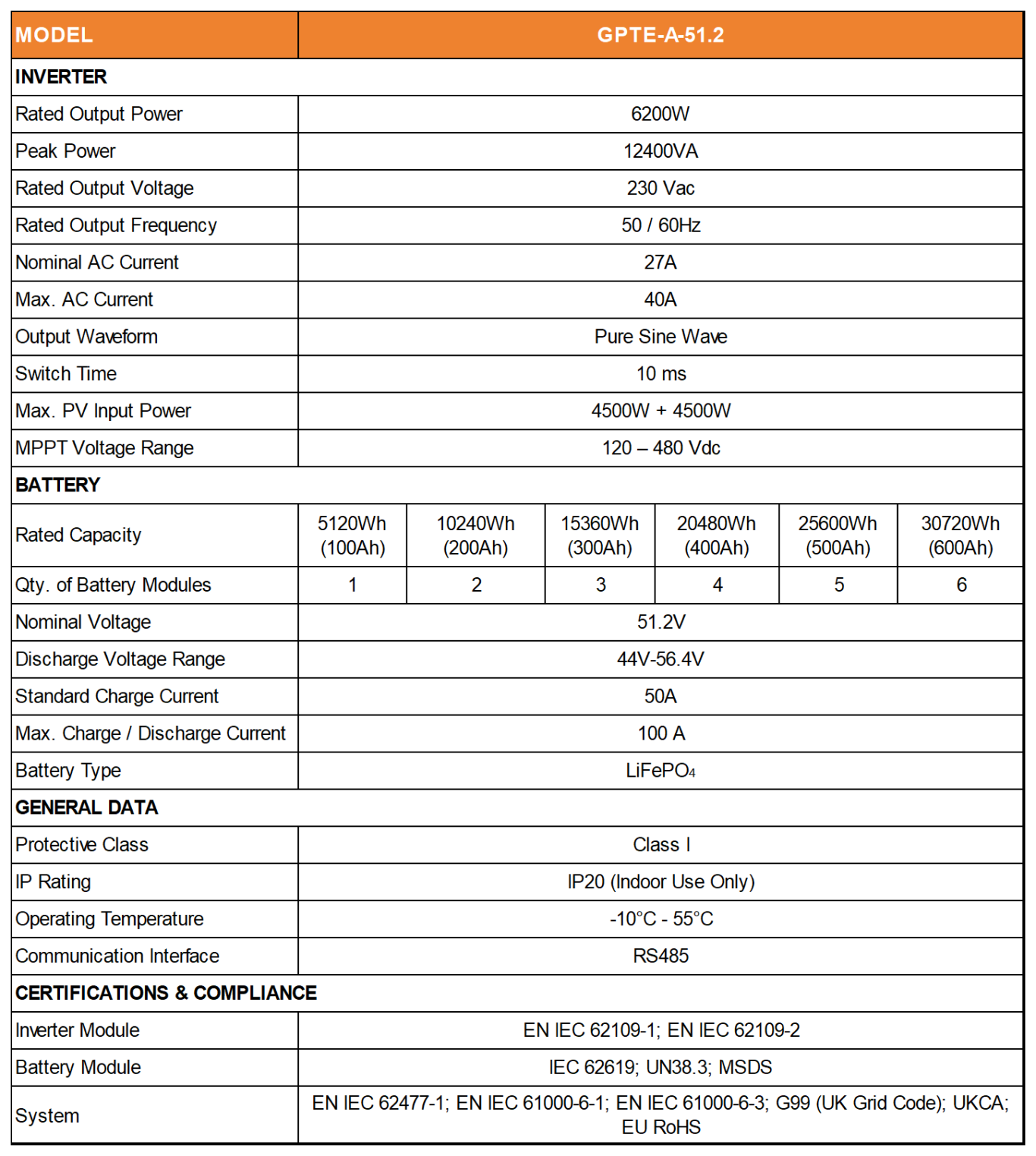 For the non-geeks - In a nutshell, this spec sheet says - The Terra A Series features a seriously powerful 6200W rated inverter (with 12,400VA peak surge, for when the kettle and induction hob fire up) that delivers clean, reliable AC electricity and switches to emergency battery backup (in a powercut) in just 10 milliseconds. It can handle up to 9kW of solar input (not required, just there if you need it!) and pairs with safe, long-life LiFePO4 batteries that scale from 5kWh all the way up to 30kWh. It’s a high-performance, UK-ready system that turns big numbers into serious home energy muscle.